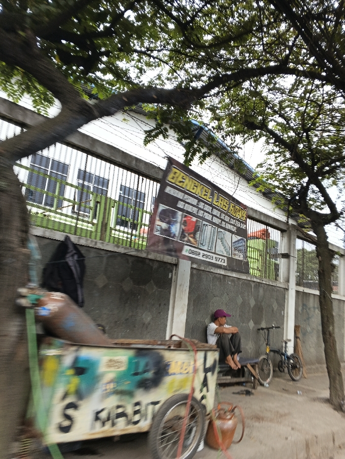 The image presents an outdoor street scene in Bandung City, Indonesia. In the mid-ground, a male individual is seated on a wooden bench against a concrete retaining wall. He wears a white t-shirt, dark pants, and a purple cap, facing right, away from the camera. Two bicycles are parked to his right: a black folding bicycle and a smaller children's bicycle. Directly above the seated man, a black and yellow banner for "BENGKEL LAS JAYA" (Jaya Welding Workshop) is affixed to a fence, featuring images of welding equipment and products, along with a phone number +0882 2903 9773. Behind the fence, a white building with dark-framed windows is visible. In the left foreground, a two-wheeled utility cart, spray-painted with "LAS KARBIT" (carbide welding) and other graffiti, is positioned. A blue-green industrial gas cylinder with a regulator is attached vertically to the front of this cart, and a smaller, reddish-brown gas tank rests on the ground near its right wheel. A dark garment hangs from a large tree trunk on the far left. The upper portion of the frame is dominated by a dense canopy of green tree foliage. The ground surface is paved.