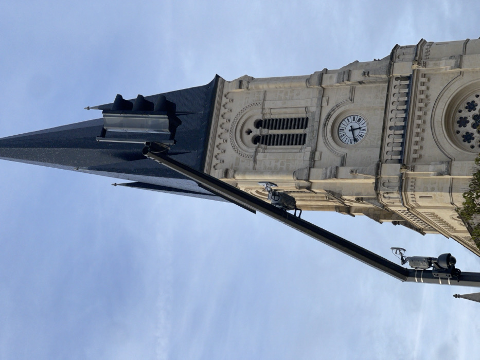 The image displays a large stone church tower, characteristic of European architecture, located in the city of Reims, France, under a clear blue sky with minimal cirrus clouds. The tower is constructed from light-colored masonry, likely limestone, and features intricate detailing. A prominent clock face with Roman numerals is visible on the lower section of the tower, indicating a time of approximately 10:10. Above the clock, an arched belfry with vertical louvers is present. The tower culminates in a steep, dark slate spire, flanked by two smaller spires, also of dark slate. In the foreground, a robust dark metallic gantry extends diagonally from the lower left to the upper right, partially obscuring the church tower. Attached to this gantry are several modern urban fixtures: a three-segment traffic light is visible on the upper right side, facing away from the viewer. Further down the gantry, approximately mid-frame, a spherical surveillance camera and two white, dish-like antenna devices are mounted. Another similar white antenna is attached higher up the gantry, near the clock face. No individuals or actions are depicted in the scene. The lighting suggests daytime conditions, with direct sunlight illuminating the church tower from the left.