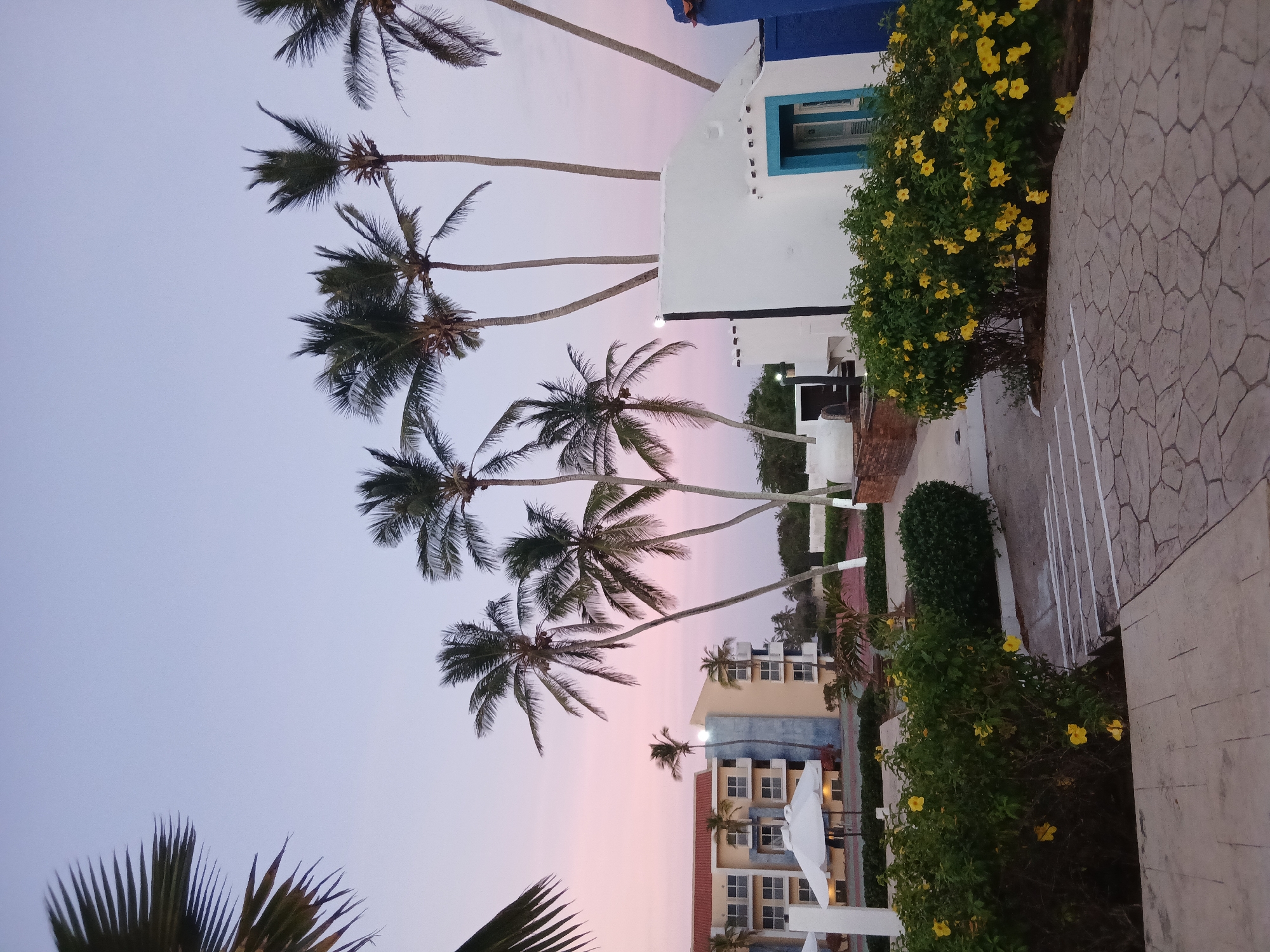 The image captures a scene in Playa El Agua, Venezuela, at dusk. Several tall palm trees are silhouetted against a sky transitioning from blue to pink. A two-story building with red tile roofing and a light blue and beige facade is visible. A smaller, white building with a blue-framed window is situated closer to the viewer. Yellow flowering bushes line the pathway, which is paved with a pattern of light grey stones. No people are visible in the frame.