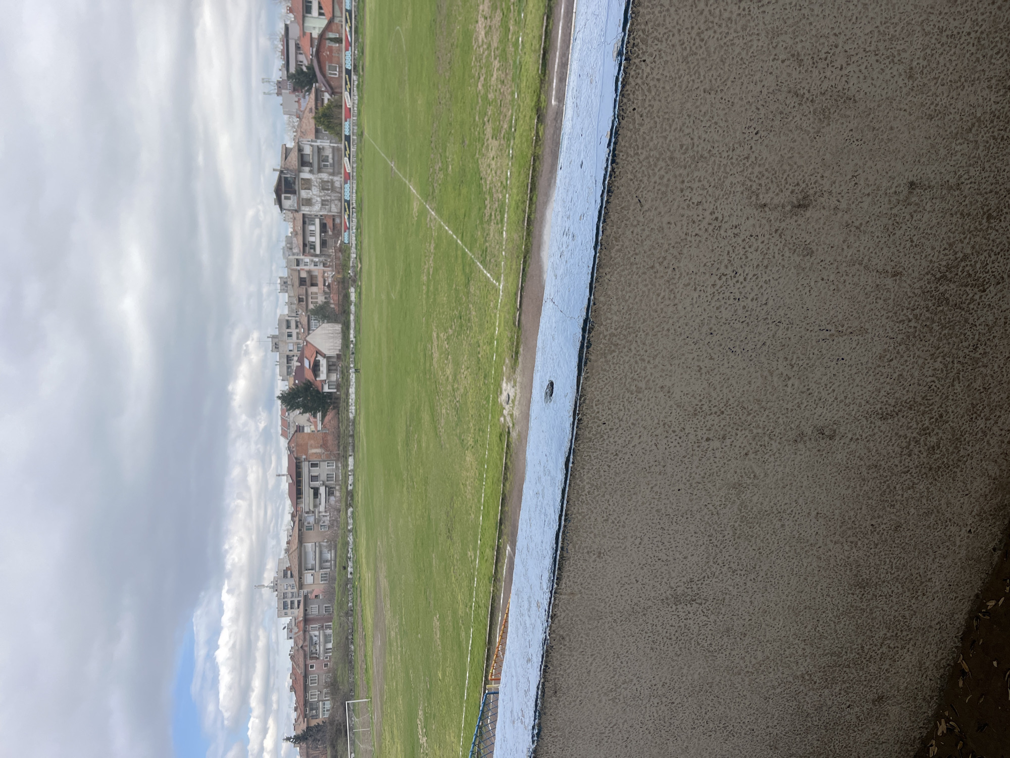 An elevated view captures a football pitch within an urban environment in Asenovgrad, Bulgaria, likely the FC Asenovets 2005 Stadium. The immediate foreground shows the textured, light grey concrete top of a stadium barrier or wall, its upper edge painted light blue. Below this barrier, a dark, soiled ground with scattered brown leaves is visible at the bottom left. The midground features a rectangular grass football field, exhibiting varying shades of green, with visible white markings for the halfway line and a portion of a penalty area. A white metal goal frame stands on the left side of the pitch. Adjacent to the grass, a dirt track or running lane encircles the field. Beyond this track and a low concrete barrier, a long advertising banner with repeating "8888" in red on a white background is visible, situated along the stadium perimeter. Two small, indistinct human figures are present on the far left of the field near the goal. The background consists of a dense residential area composed of multi-story buildings with a mix of architectural styles, predominantly featuring red-tiled roofs. Some structures appear older, while others are taller apartment blocks. Sparse, bare trees are interspersed among the buildings and along the field's edge. The sky is largely overcast with grey clouds, though a small patch of blue sky is visible in the upper left quadrant. The overall lighting suggests an ambient, non-direct light condition. No specific actions or interactions are discernible among the distant figures.