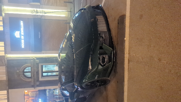- "A dark green Lamborghini supercar, possibly an Aventador model, is parked facing the viewer on an asphalt street in front of commercial buildings at night" by FM-Emas82, licensed under CC BY 4.0