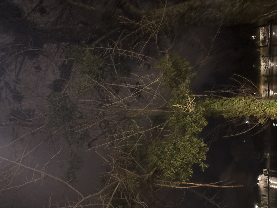 A night scene depicts trees and water. Bare branches intertwine with evergreen foliage. In the upper-left, thin branches dominate against a dark, foggy backdrop. To the right, dense green foliage contrasts with the dark water's reflection. Light reflects on the water's surface, hinting at a nearby structure. The composition balances between the starkness of winter branches and the lushness of evergreen vegetation.