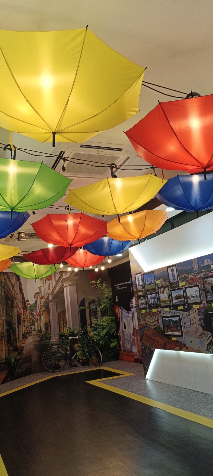 Colorful umbrellas adorn the ceiling, casting a warm glow