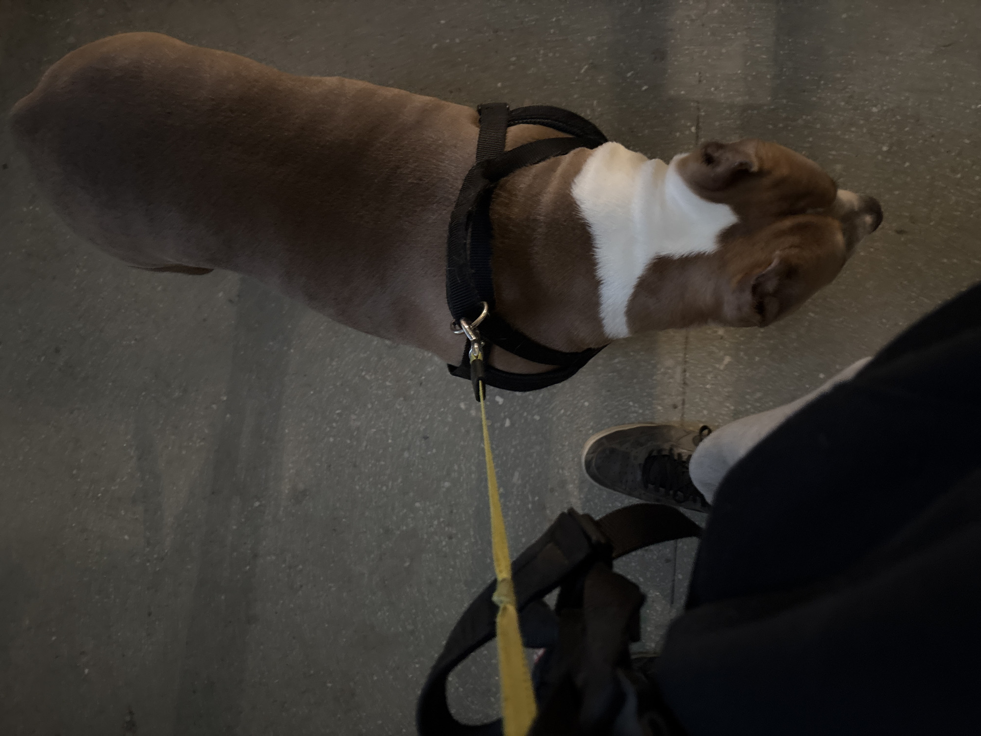 A high-angle, dimly lit image depicts a person walking a dog on a paved surface in Minsk, Belarus. A large, muscular dog, primarily brown/fawn with a distinct white blaze on its face and chest, occupies the right and central portion of the frame, facing away from the camera. The dog is wearing a black nylon harness, to which a bright yellow leash is attached via a metal clip. The lower left leg and foot of a person are visible in the bottom left quadrant, clad in dark trousers and a gray shoe with dark laces; this person is holding the yellow leash. The ground beneath the subjects is a dark, speckled gray, consistent with concrete or asphalt.
