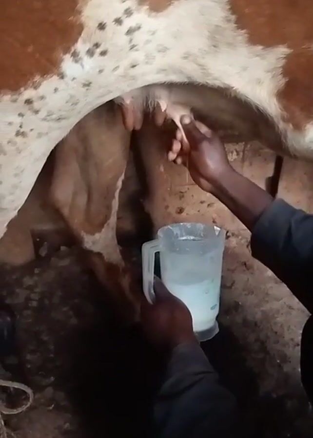 A person with dark skin is milking a cow. The person is kneeling on the ground and is holding a clear plastic pitcher in one hand to catch the milk. The other hand is milking the cow's udder. The cow is brown and white with a large udder. The person is wearing a dark shirt. The scene is taking place inside a barn or shed. The ground is dirty and there are some ropes visible. Some music plays in the background.