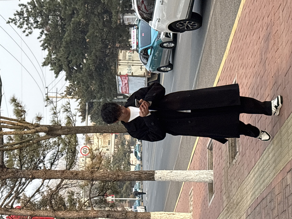 The image depicts a daytime street scene in the city of Linghe, China. In the foreground, an individual, likely male, with dark, curly hair and eyeglasses, walks on a reddish-brown brick-paved sidewalk. He is dressed in a black, double-breasted long overcoat, a white t-shirt, dark trousers, and black and white sneakers. The individual is looking down and operating a silver-backed smartphone held in both hands. The sidewalk is lined with several thin-trunked trees, some with white painted bases, and separated from the street by a yellow curb. The street, a multi-lane thoroughfare, features vehicular traffic. A white SUV is partially visible in the right foreground, followed by a light blue taxi with a roof sign. Further in the background, a white box truck displaying "G6 W62" and a red banner with Chinese characters is present. Additional light blue vehicles, consistent with taxis, are visible on the far side of the street. A circular speed limit sign displaying "40" is positioned in the middle ground. Overhead power lines crisscross against the sky, and dense green conifer trees are visible in the background. A lone pedestrian can be seen walking in the distant background across the street.