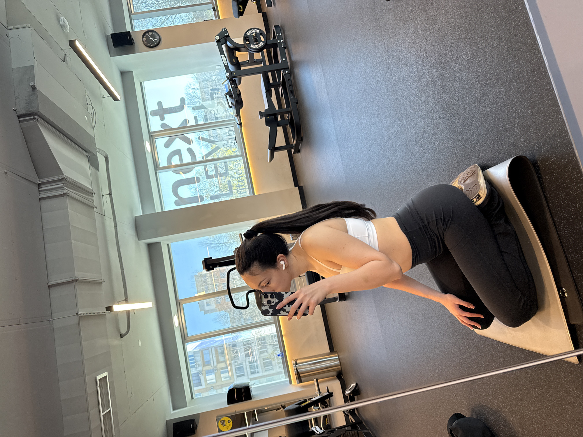 A young woman is in a gym, positioned on an exercise mat, taking a selfie with her smartphone. She is wearing a white sports bra, black leggings, and tan sneakers. She has dark hair pulled back in a ponytail and is wearing an earbud. The gym has large windows with a view of a city. Outside the windows, the word "next" is visible in large letters. Gym equipment is scattered throughout the space. The image is slightly tilted, creating a distorted perspective. Given the word "next" on the building visible through the window and the urban setting, the location is potentially in Sofia, Bulgaria, where there is a gym franchise named "Next Level."