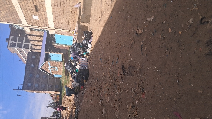 An outdoor scene shows a dirt path littered with trash bags against a backdrop of buildings