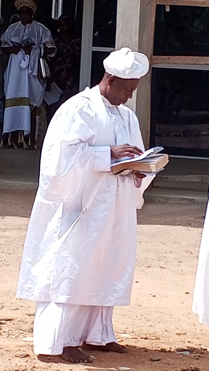 An outdoor scene in Egbedi, Nigeria, depicts a dark-skinned adult male in the foreground, standing barefoot on dry, light brown earth. He wears a full white ensemble consisting of a long-sleeved robe and a matching soft cap. His head is bowed, focusing on a thick, light-colored book with a visible golden spine, which he holds open with both hands. In the background, partially obscured by a dark framed doorway or window, another individual, a woman, is visible. She also wears white attire, featuring gold patterned trim on the lower half of her robe, and a light-colored headwrap. She appears to be holding a white object, possibly a bag or book, near her waist. The building behind them features light-colored walls adjacent to the dark-framed opening. Small stones and debris are scattered across the dusty ground.