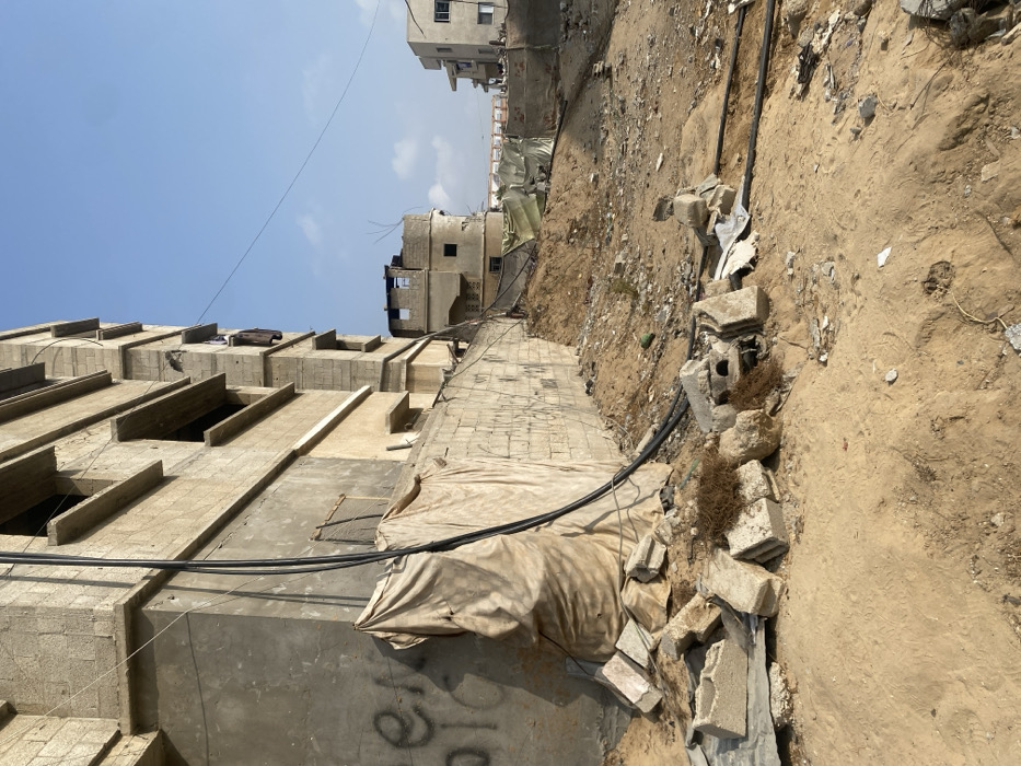 A low-angle shot shows a concrete building under construction, possibly unfinished, with exposed rebar and openings. A tan tarp covers part of the structure. Debris, including broken concrete pieces, is scattered on the ground. Black cables run along the building's exterior. In the background, a partially destroyed building stands with visible damage. The sky is clear and blue. The ground is sandy and littered with debris, suggestive of a construction site or a war-torn area.