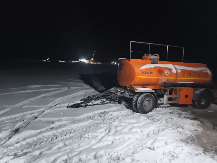 An orange tanker trailer with "NEFAZ" and "ОГНЕОПАСНО" written on it sits on snow-covered ground at night