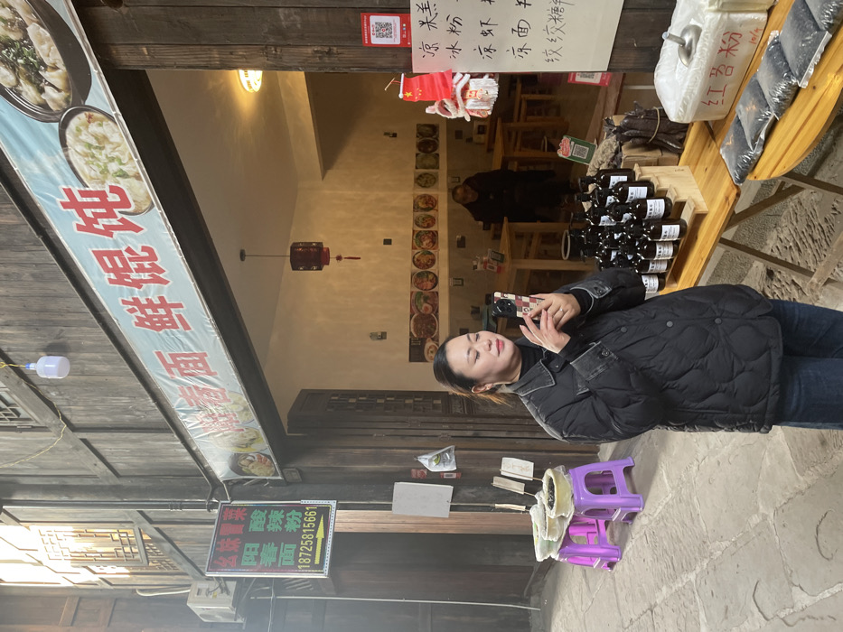 A woman in a black jacket is photographing a display of bottled products, red sweet potato flour, and bags of goods. A sign advertises "yangsuan chunla mianfen" and lists a phone number: 18725815661. Another sign offers "mian xian huntun," along with "liang gao, shui fen yi, liang xia, liang mian," and "jiao jiao tang chan." Restaurant interiors are visible in the background with a red lantern hanging from the ceiling.