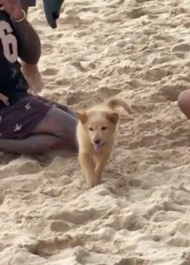 small, light brown puppy with floppy ears walking on a sandy beach. A man kneels nearby and reaches out to the puppy. The puppy then starts running across the sand. Other people are visible in the background.
