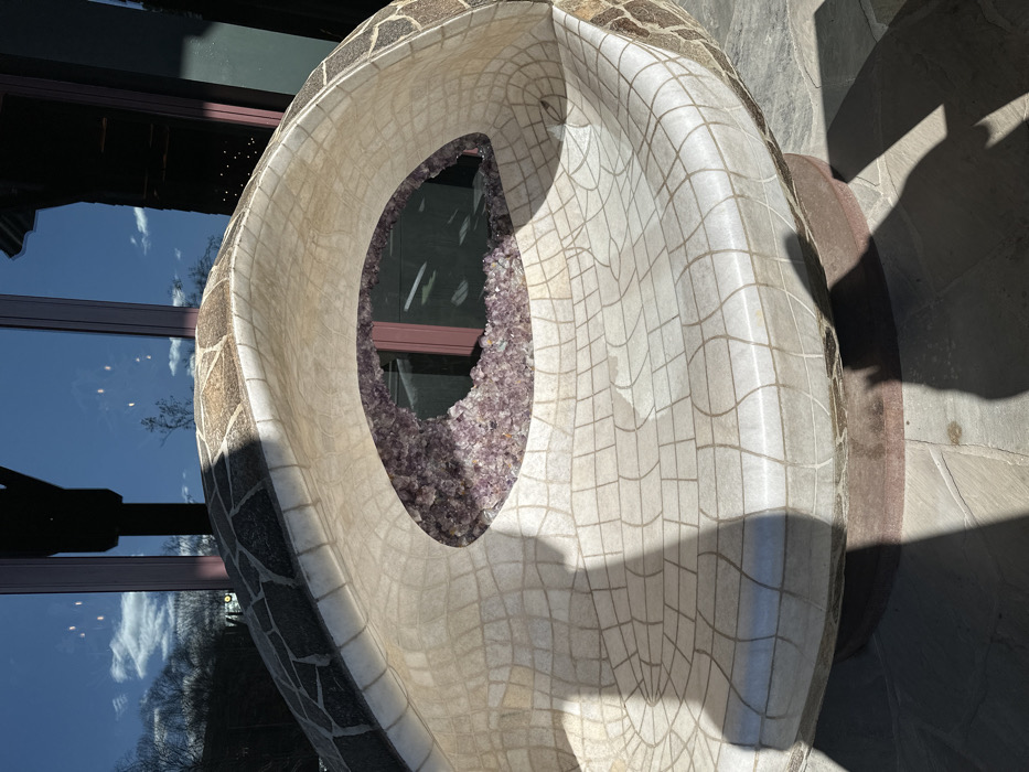 A contemporary outdoor sculpture with a hollow, ovoid core filled with amethyst crystals. The sculpture's exterior is adorned with beige and brown square tiles, evoking a mosaic-like texture. Reflected in a nearby window are trees and sky. Sunlight casts sharp shadows onto the sculpture and adjacent ground.