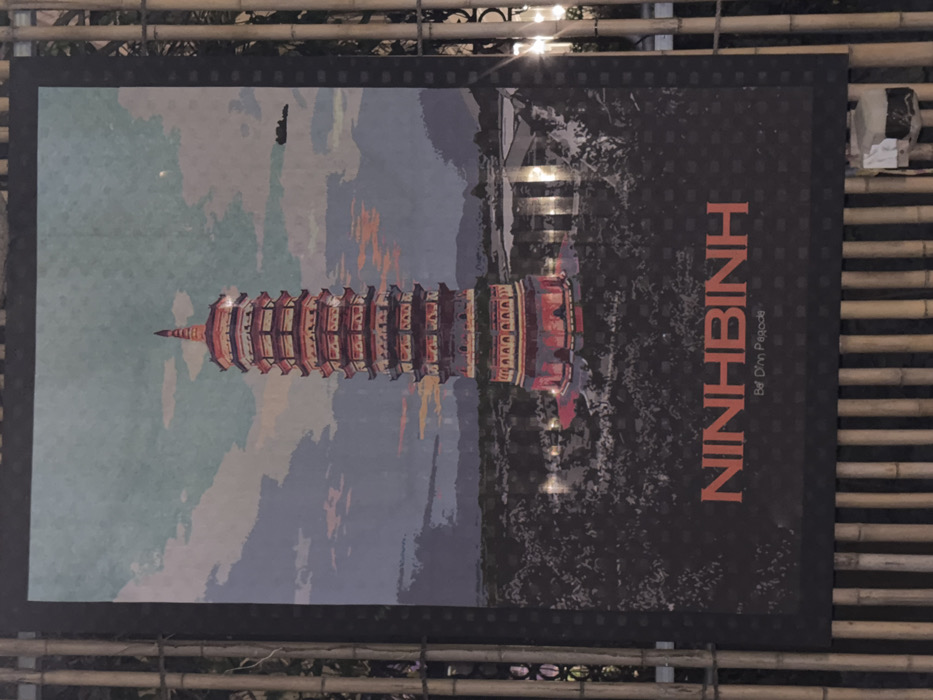 A large, vertically oriented poster is displayed outdoors at night in Nam Hoa Lư Ward, Vietnam. The poster features an artistic illustration of the multi-tiered Bai Dinh Pagoda, illuminated with red and pink lights, against a twilight sky with hues of blue, grey, and orange. Dark, forested landscapes are depicted in the foreground and surrounding the pagoda. Below the illustration, the word "NINH BINH" is prominently displayed in orange capital letters, with "Bai Dinh Pagoda" written in smaller white text beneath it. The poster is framed and held in place by numerous vertical bamboo poles visible on both its left and right sides, as well as along the bottom. Artificial light sources, including a visible string of white lights on the right, cast reflections on the poster's surface. A small, light-colored utility box is attached to the bamboo structure on the lower right. No individuals are present in the scene.