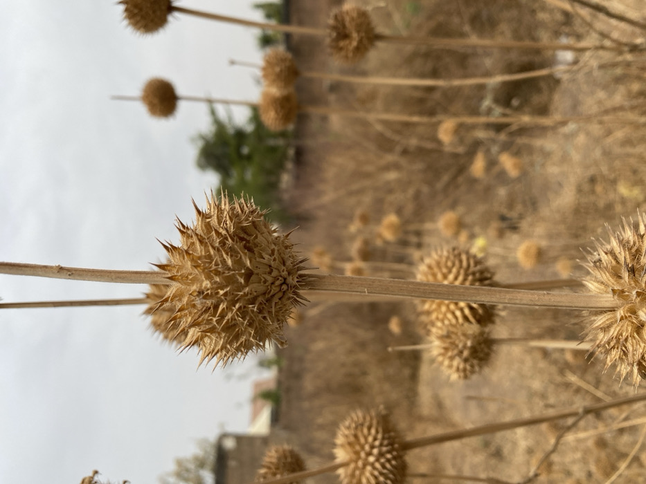 The image presents a close-up, ground-level view of a field in Bukuru, Nigeria, dominated by dried plant matter under an overcast sky. In the immediate foreground, a singular, desiccated, spherical seed head with numerous pronounced spikes is centrally positioned on a thin, erect, tan-colored stalk, rendered in sharp focus. This seed head exhibits a golden-brown hue. Adjacent to it and throughout the midground, numerous similar dried, spherical seed heads on varying lengths of tan stalks extend into the distance, forming a field of uniformly golden-brown, withered vegetation. The ground visible between the stalks also consists of dry earth and dead plant material. In the background to the left, a light-colored building with a reddish-brown sloped roof is partially visible behind a low, brown wall or fence. To the right in the background, a cluster of green tree foliage provides a contrast in color. The sky overhead is a uniform light grey, indicating an overcast condition. No individuals, animals, or active subjects are present in the scene.
