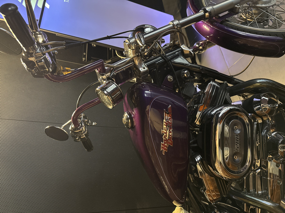 - "A metallic purple Harley-Davidson Sportster 1200 motorcycle is prominently displayed indoors within the city of Alcobendas, Spain" by FM-93yLy1, licensed under CC BY 4.0