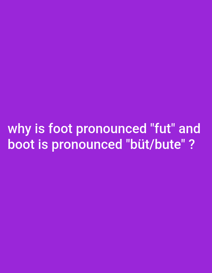 The image displays a text-based question against a solid purple background. The question inquires about the differing pronunciations of the words "foot" and "boot." It specifically asks why "foot" is pronounced as "fut" while "boot" is pronounced as "büt/bute." The inquiry highlights the inconsistency in how the double "o" is pronounced in these two similar words.