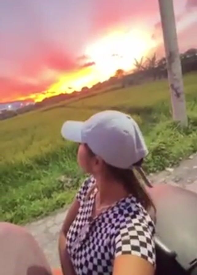 woman sitting on a motorcycle on a paved road next to a rice field at sunset. The sky is a mix of red, orange, and purple. The woman is wearing a black-and-white checkered shirt and a light-colored baseball cap. She is looking at the sunset and then at the camera. There is a utility pole next to her. The motorcycle engine can be heard.