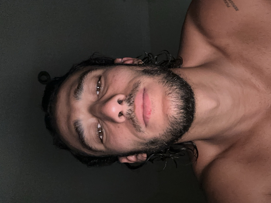 A shirtless man with a trimmed beard and mustache faces the camera. His dark hair is pulled back, with a small bun visible. His eyes are a warm brown. He has a nose ring and earrings. The background is dark, creating a dimly lit atmosphere. Part of a tattoo is visible on his upper chest. He is angled slightly, not directly facing the lens.