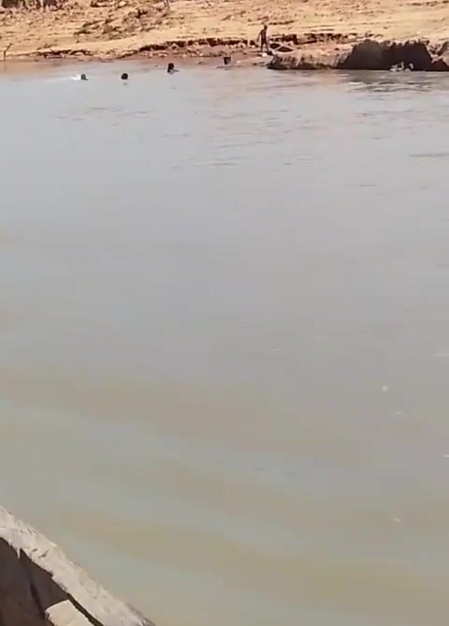 river scene from the perspective of a small boat. Several people are swimming in the river near the shore. The shoreline is a light brown, rocky, and eroded. There are a few buildings visible in the background on top of the elevated shoreline. The water is slightly murky. The sky is clear and blue. The shot is stable, originating from a boat moving across the water.