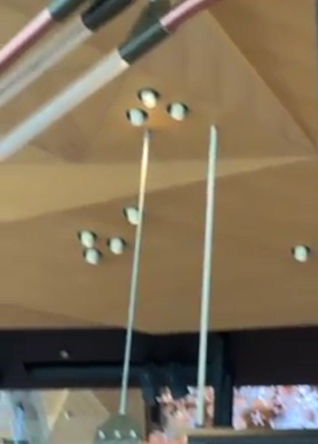 n interior shot of a building with an interesting architectural design. The ceiling is constructed with light-colored wooden panels arranged in a geometric pattern, complemented by recessed lighting. A system of copper pipes and clear tubes runs across the ceiling. An electronic display is mounted on one of the copper pipes, showcasing text in Japanese. The camera focuses on the ceiling, shifting slightly to highlight the pipes, tubes, and the lighting arrangement, which creates an impression of a modern and design-centric space.