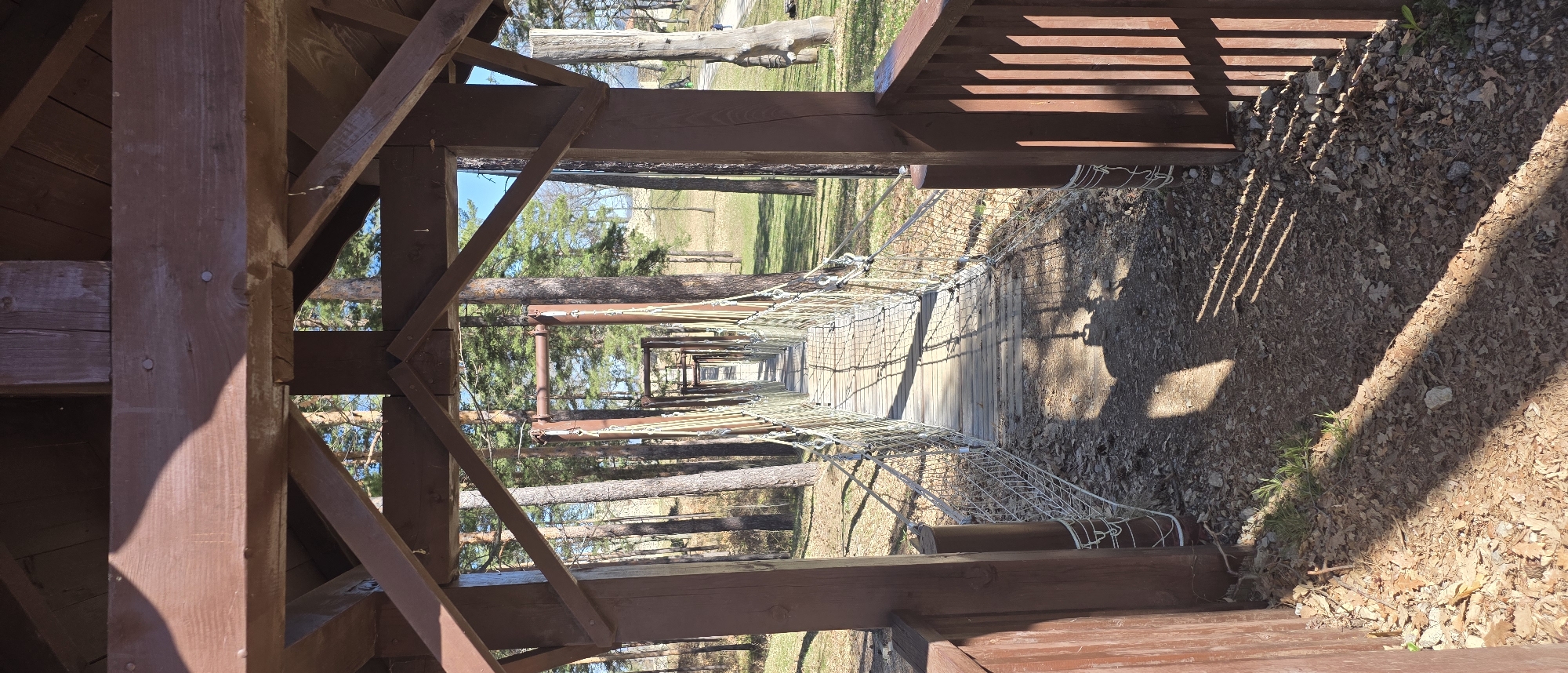 View of the suspension bridge with a wooden structure and mesh sides at the ancient fortress "Tsar Samuil" in the village of Belchin, Bulgaria. The wooden pillars and planks of the bridge structure are dark brown. The ground is covered in dry leaves and gravel. The sky is visible through the trees. The image is taken from a slightly elevated perspective, looking down the length of the bridge.