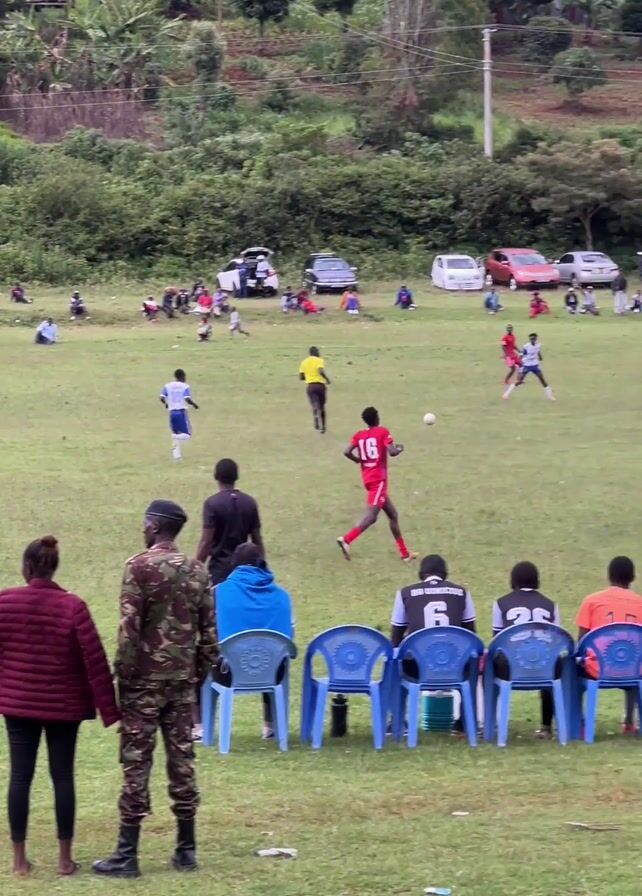 soccer game on a grass field. Players in red and blue uniforms compete for the ball. Spectators, including some seated in plastic chairs, watch from the sidelines. Two individuals in military-style camouflage uniforms stand near the field, one with their hand touching a woman's hand. A line of cars is parked in the background. The environment includes lush greenery and trees surrounding the field. The weather appears overcast.