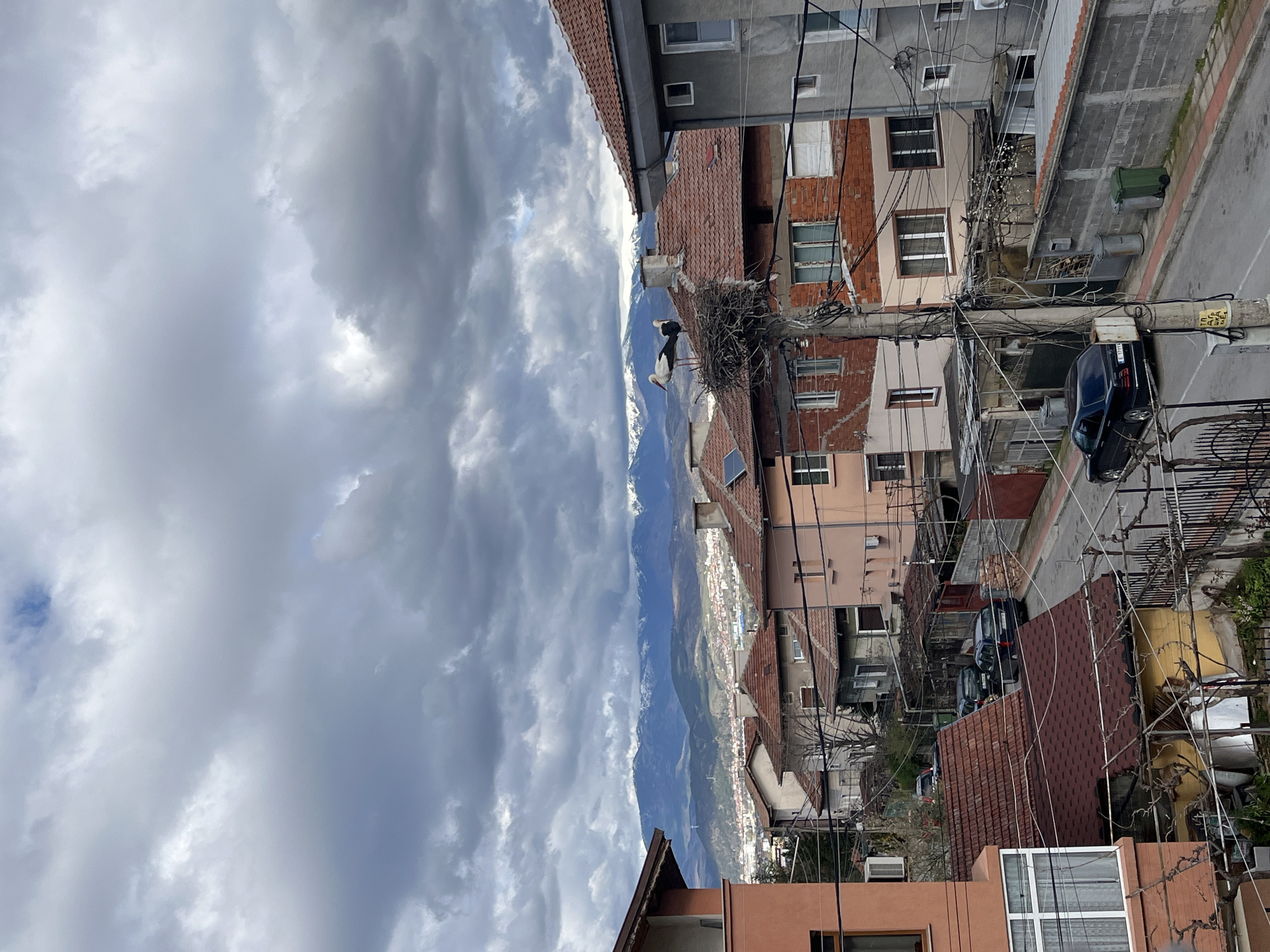 view of the city of Pokrovnik, Bulgaria, with a cloudy sky overhead. In the foreground, there is a stork nest atop a utility pole, occupied by two storks. Behind the nest, the cityscape includes a mix of buildings with red-tiled roofs and concrete structures, interspersed with a complex network of overhead power lines. In the background, there are mountains visible, suggesting that the city is located in a valley or basin. A street is visible in the right side of the frame containing cars parked along its edge.