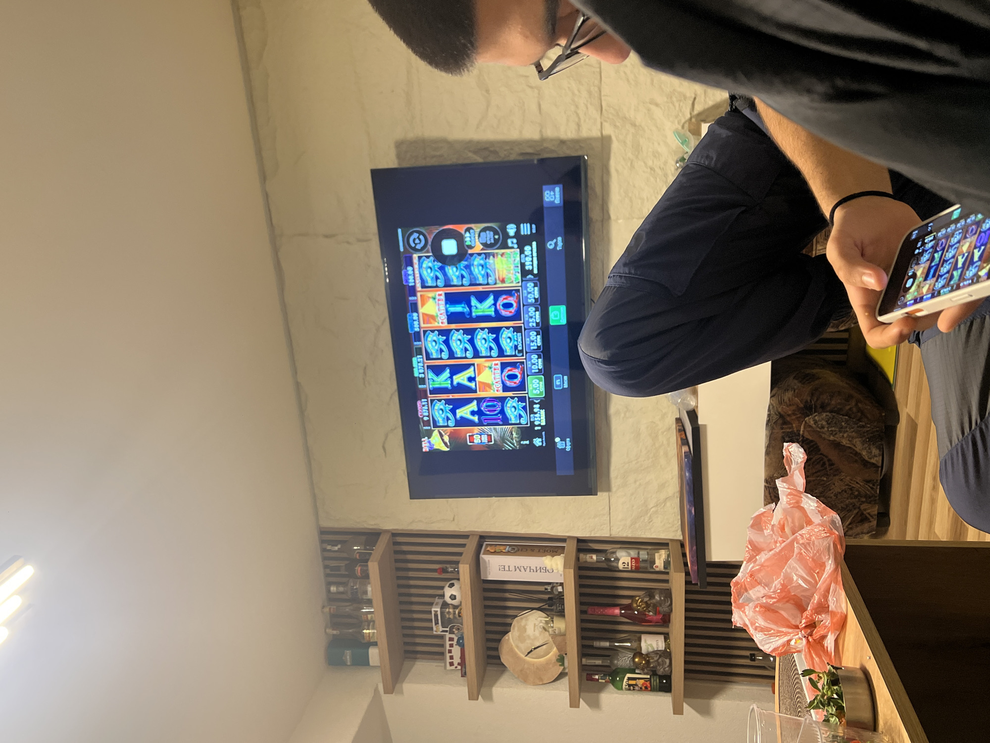 A person in dark clothing, possibly male, is watching a slot machine game on a television screen while simultaneously interacting with a similar game on a smartphone. The individual is seated indoors. Below the television screen, there's a shelf stocked with various items, including bottles and decorative objects. A partially visible shopping bag is placed on a surface near the shelves. The location is unspecified, and there is no indication of Staro Zhelezare, Bulgaria.