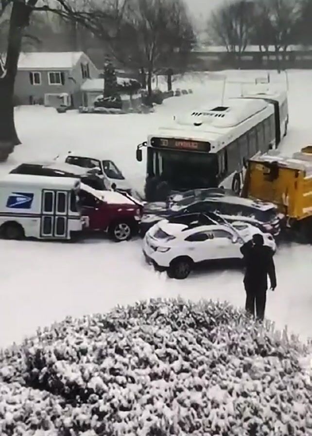 large pileup of vehicles in a snow-covered area. There is a bus, a USPS truck, several cars, and a yellow vehicle that may be a snowplow involved in the pileup. A person in a dark coat stands near the vehicles, seemingly observing the scene. The ground is covered in snow, and there are houses and trees visible in the background. It appears to be a snowy, overcast day.