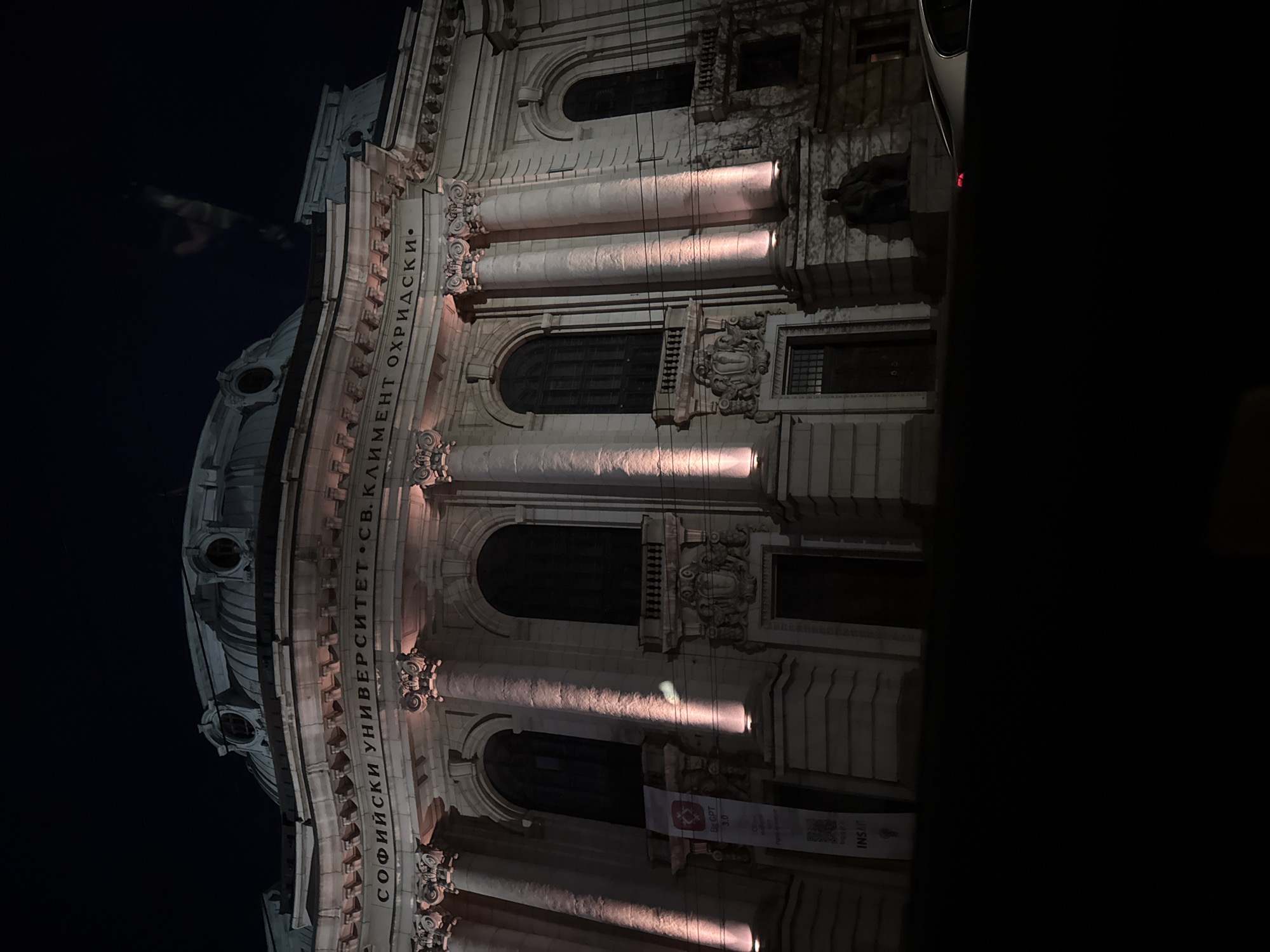 facade of Sofia University "St. Kliment Ohridski" at night, located in Sofia, Bulgaria. The building's architecture is illuminated with spotlights. The name of the university is visible on the building's exterior in Bulgarian. There are posters or banners hanging on the building's front. A portion of a vehicle intrudes on the right side of the frame, possibly suggesting the shot was taken from inside a car. The sky is dark, indicating it is nighttime.