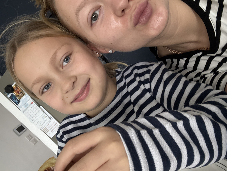 The image captures a close-up, indoor portrait of two individuals: an adult female and a young female child, presumed to be in Ariel, Palestinian Territory