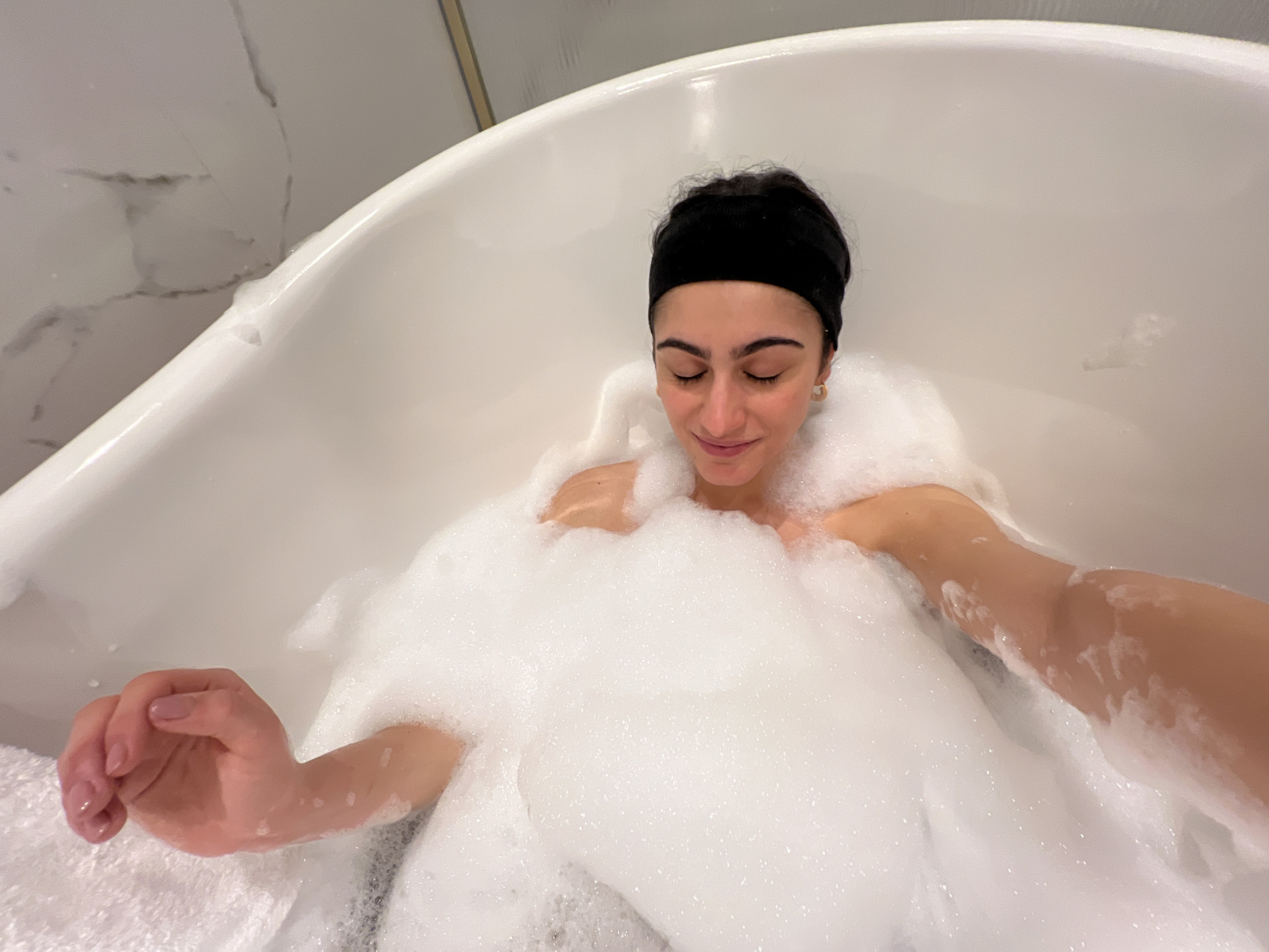 A young woman with dark hair and a black headband is submerged in a bathtub filled with white bubbles