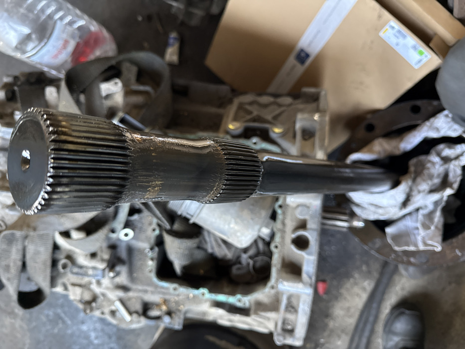 A vertical, dark metallic shaft with splines on both visible ends dominates the foreground, coated in a viscous, dark fluid
