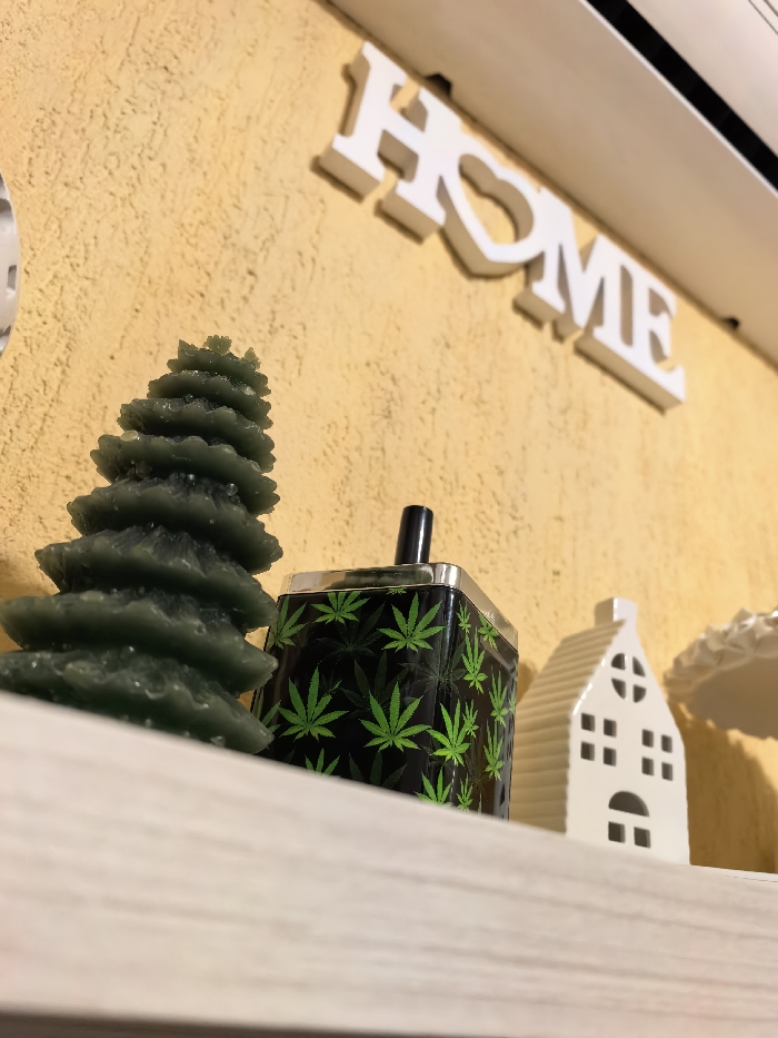 A still life image captures a collection of decorative objects arranged on a light-colored shelf against a textured yellow wall in Mikrevo, Bulgaria. On the left, a dark green, multi-tiered candle, resembling a pine or Christmas tree, stands upright. Adjacent to it, centrally positioned, is a black rectangular container featuring a repeating pattern of bright green cannabis leaves. This container has a metallic silver top and base, with a black cylindrical element protruding vertically from its center. To the right of the cannabis-patterned container, a small, white ceramic figurine shaped like a house is visible, featuring cut-out windows and a door. Mounted on the yellow wall above these items are white three-dimensional letters spelling "HOME," where the "O" is represented by a heart shape. A segment of a white fixture, likely an air conditioning unit or another shelf, is visible at the upper right edge of the frame.