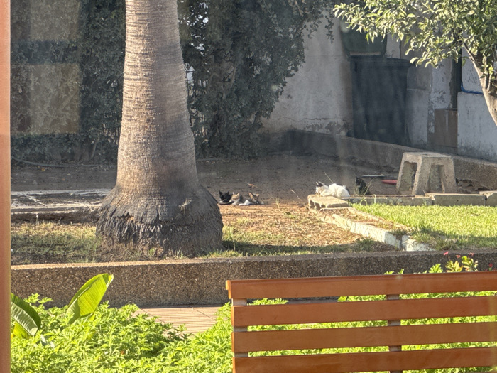 The image depicts an outdoor scene in Salé, Morocco, under bright daylight. In the immediate foreground, to the lower right, a section of a slatted wooden bench, colored orange-brown, is visible. Adjacent to it, on the lower left, are vibrant green, low-lying plant foliage. The middle ground is defined by a broad, dark brown palm tree trunk with a rough texture, centrally positioned on the left side of the frame. The base of the trunk appears darker, possibly scorched. Four domestic cats are present in this area. Two cats, one dark-furred and another with lighter, tan and white fur, are resting on the bare earth near the base of the palm tree. To the right of the palm tree, a white and black cat is lying on a raised concrete ledge, facing left. Partially obscured behind this cat and a concrete block is another dark-furred cat. The ground consists of a mixture of dry earth, sparse grass, and patches of manicured green lawn, separated by low concrete borders and planters. Various weathered concrete blocks and structures are scattered across the scene. The background features a light-colored concrete wall, which exhibits staining and signs of wear. Densely packed green trees and foliage are visible behind the wall and along the right side of the frame. The scene is illuminated by sunlight, casting some shadows. No human figures are present.