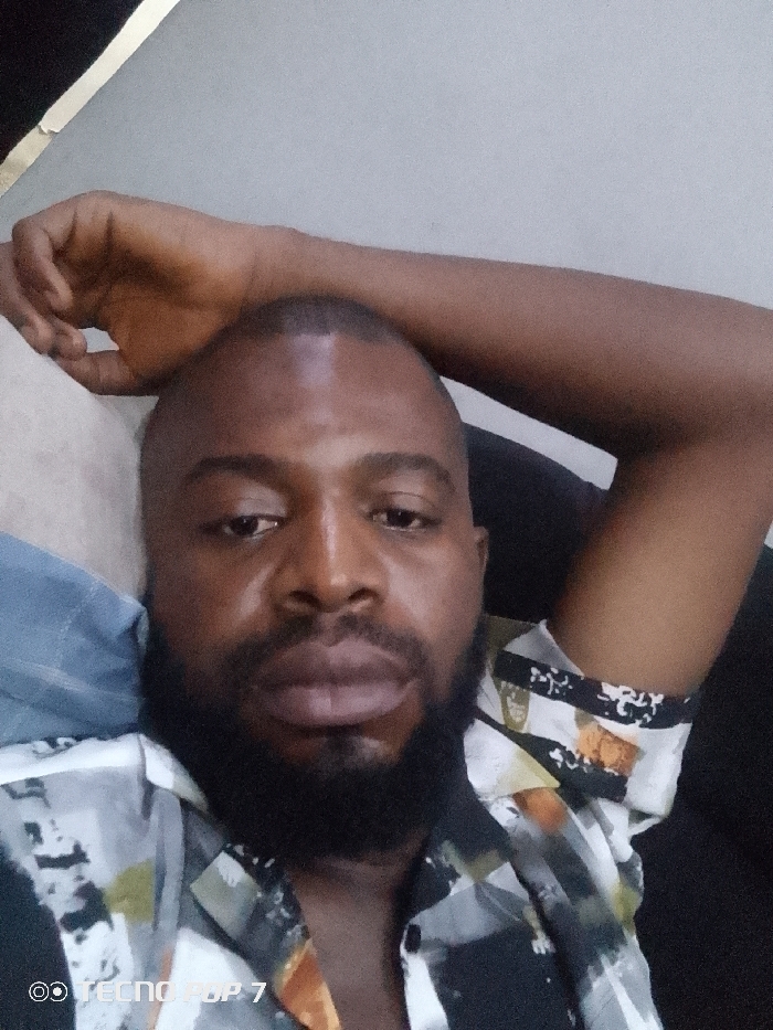 A bald, dark-skinned man with a full beard looks at the camera. His left arm is raised above his head. He is wearing a patterned shirt with white, black, yellow, and gray. He appears to be lying down. The background is plain white. A blue object is partially visible. The lower left corner of the image features the text "tecno pop 7".