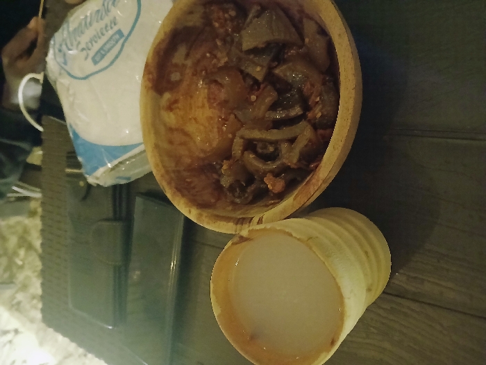 - "A wooden bowl filled with a dark, saucy dish containing what appears to be chopped vegetables and possibly meat sits next to a paper ice cream cone filled with a white liquid, likely milk or ice cream" by FM-0N84M2, licensed under CC BY 4.0