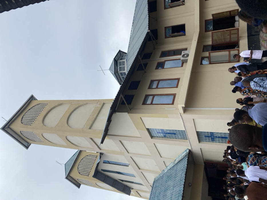 The image depicts a large, modern church building with two tall, square towers, located at coordinates -6.889 latitude and 39.286 longitude in Dar es Salaam, Tanzania. The church is constructed of tan-colored concrete blocks with a teal-colored roof. The building has multiple large windows with dark wooden frames. There is a cross on top of the main roof and smaller crosses on the side walls. A crowd of people are gathered in front of the church, appearing to be attending a service. The majority of the people are dressed in formal attire, with men wearing suits and women wearing dresses or skirts. Several people are standing in small groups, talking and interacting with each other. The sky above is overcast with gray clouds.