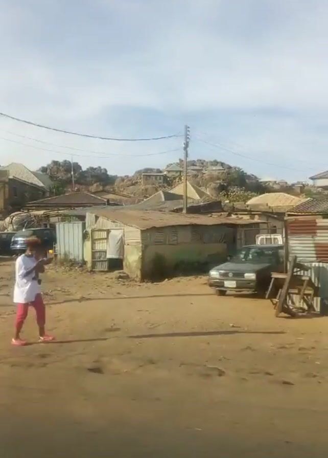 view from a moving vehicle driving through a somewhat rural or impoverished area. The roads are unpaved. The buildings along the roadside appear to be constructed with corrugated metal and other basic materials. Several cars are parked or driving along the road. A man is seen walking along the roadside. Trees and powerlines are visible. The sky is light blue.