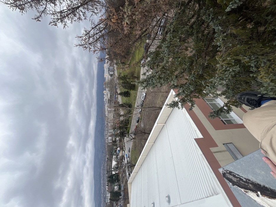 A high-angle, panoramic photograph captures an urban landscape under an overcast sky, with mountains in the far background. In the bottom-left foreground, the lower legs of one individual are visible, clad in beige trousers and a dark athletic shoe with a blue sock. The individual appears to be perched on a weathered, grey metallic ledge. Immediately below the vantage point, and occupying the lower-left to mid-left frame, is the extensive, ribbed, silver-colored metal roof of a multi-story building. Below the roofline, the building's facade is visible, characterized by a beige base color with a distinct reddish-brown horizontal band running along the top, above multiple rows of white-framed windows. To the right of this building, a dense cluster of blue-green evergreen trees partially obscures the view, accompanied by bare deciduous branches. The mid-ground and background reveal a sprawling urban environment. A multi-lane road is visible with several parked and moving vehicles, including a white public transport bus with blue accents. Various multi-story buildings of differing architectural styles, including modern glass-fronted structures and older residential blocks, are scattered across the urban expanse. Several green, park-like areas are interspersed within the city layout. In the far background, a range of hills or mountains, partially obscured by low-hanging grey clouds, defines the horizon. The sky above is uniformly overcast. The scene depicts the **Studentski Grad (Students' Town)** district of **Sofia, Bulgaria**. The vantage point is from a high elevation, likely a rooftop, generally facing southwest towards the prominent **Vitosha Mountain** range in the distance. The building directly below the vantage point, with the beige and reddish-brown facade and ribbed roof, is consistent with structures found within the **University of Forestry** campus.