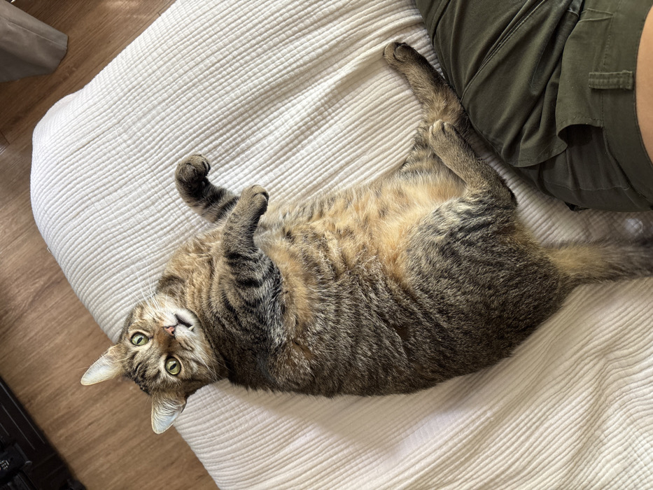- "A tabby cat lies on its back on a white textured bedspread" by FM-mU2BK2, licensed under CC BY 4.0