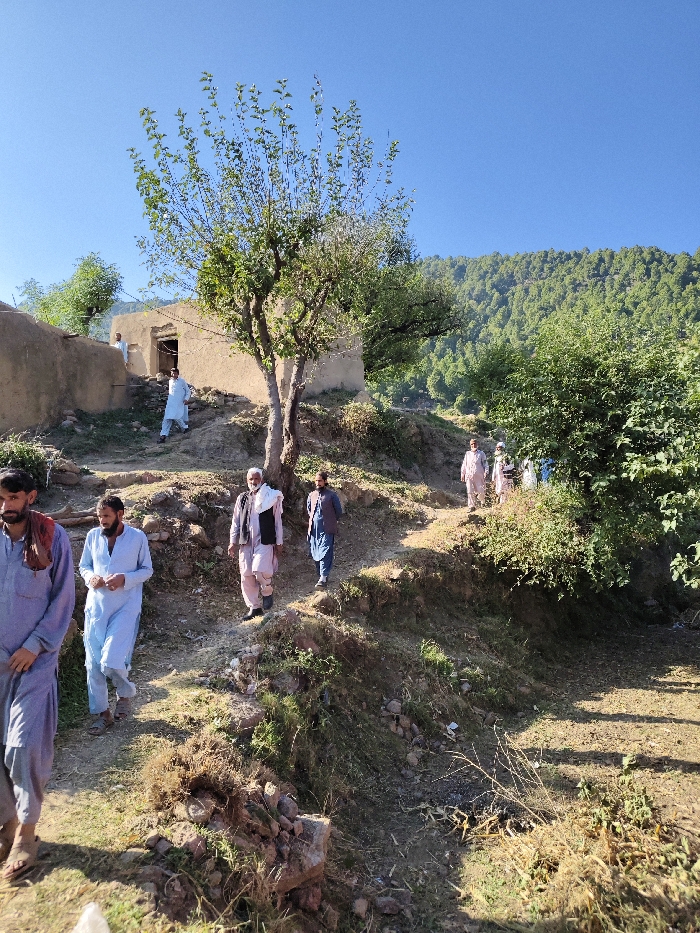 A group of men traverses a sunlit, hilly terrain. Some wear traditional light-colored shalwar kameez, while others have shawls draped over their shoulders. An old, mud-brick building stands near a tree, and a few figures can be seen near its entrance. The backdrop is a lush, forested mountain under a clear blue sky. The foreground shows dry grass and rocky soil.