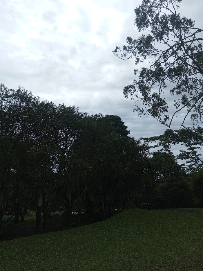 A landscape scene under a cloudy sky showcases a patch of green grass in the foreground. A line of trees is situated behind the grass. To the right, a larger tree with visible branches stretches into the sky. The overall image has a muted, slightly dark tone, suggesting an overcast or dimly lit environment.