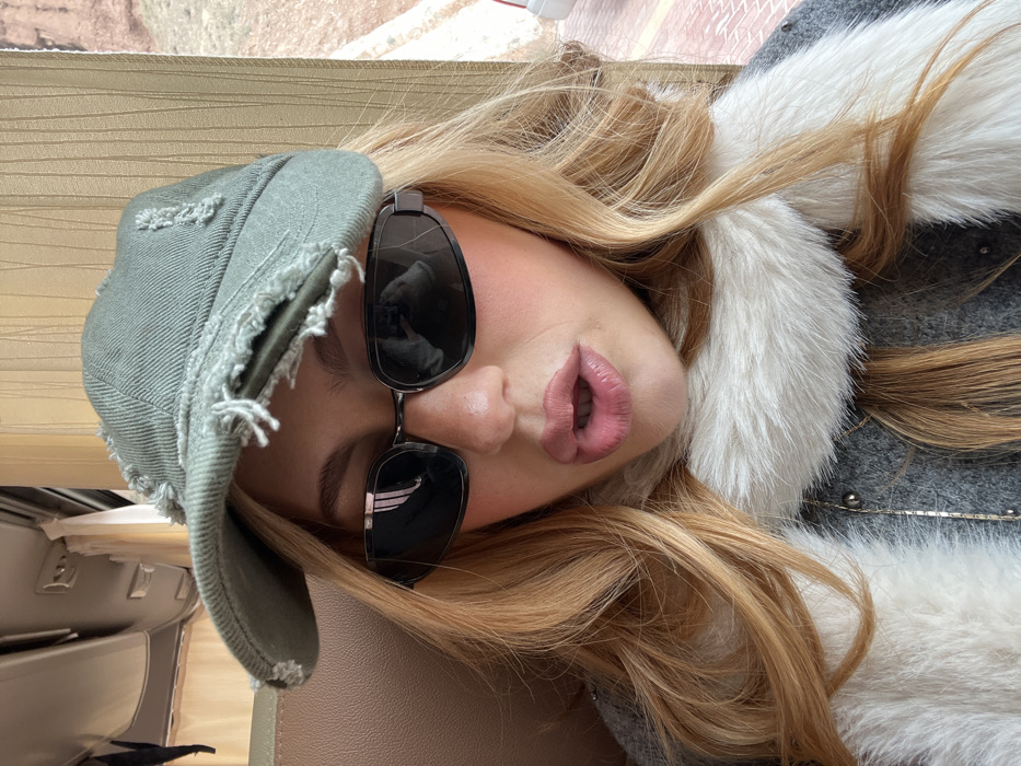 A close-up selfie-style image features an individual with blonde hair, positioned centrally within what appears to be a vehicle