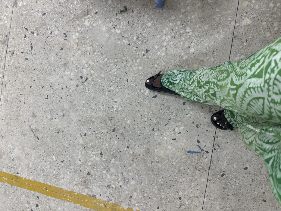 An overhead shot captured in Karmajiji, Nigeria, depicts the lower extremities of an individual standing on a light grey terrazzo or concrete floor. The person wears wide-leg trousers or a skirt with a green and white intricate pattern. Dark-colored, open-toe sandals are on the feet, revealing toenails painted white. A faded yellow painted line runs diagonally from the upper left corner across the floor. A thin, dark linear mark is visible horizontally across the lower portion of the frame. A small, bent piece of blue material rests on the floor to the left of the person's feet. The floor surface exhibits scattered dark and light aggregate, along with minor dirt and scuff marks.