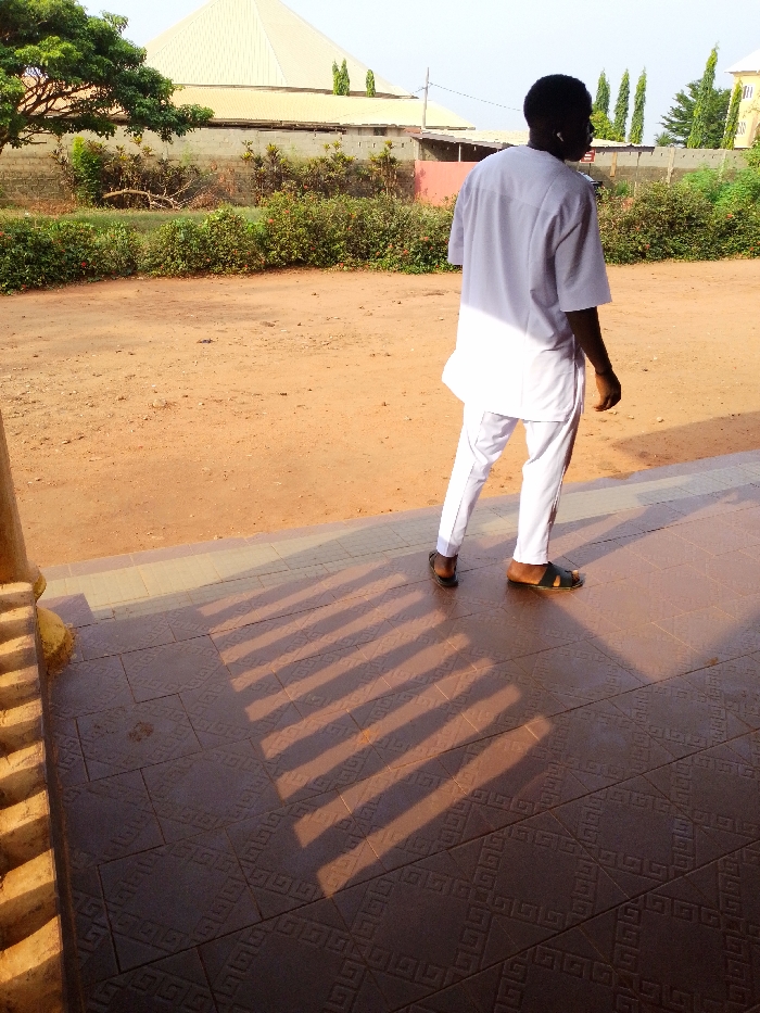 An individual stands on a dark brown tiled floor featuring a geometric pattern in Nsugbe, Nigeria. The subject, viewed from behind and slightly to the right, is a male wearing a white short-sleeved tunic and white trousers, paired with black open-toed sandals. A white earpiece is visible in his right ear. Prominent parallel shadows are cast across the tiled surface from an unseen overhead structure. The tiled area transitions into a reddish-brown dirt ground. Beyond the dirt ground, a dense row of green bushes extends horizontally, backed by a low concrete block wall. In the mid-distance, a large building with a distinctive light-colored, multi-faceted, or pyramidal roof is visible. Several tall, slender, conical evergreen trees are present in the background, along with a partial view of another light-colored building on the far right. A utility wire is discernible in the upper left background. The sky is bright and clear, indicating daytime conditions. The individual's action is stationary observation of the environment ahead.
