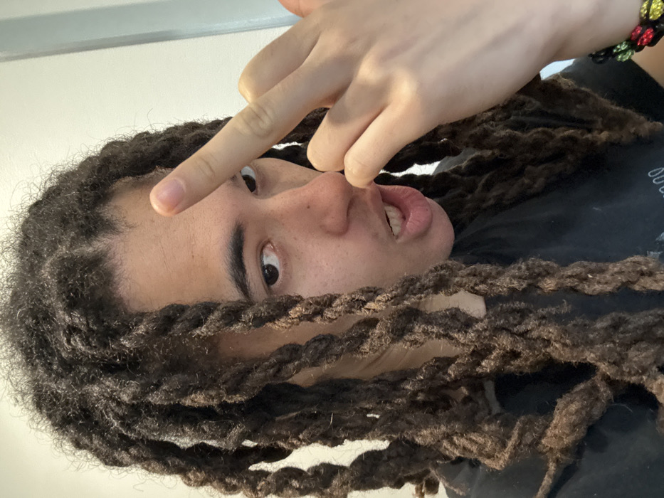 A frontal, medium close-up photograph depicts a single individual, located in an indoor environment in Les Ulis, France. The subject has dark brown dreadlocks and is looking directly at the camera. Their right hand is raised, with the middle finger extended vertically while the thumb is bent inward and the other fingers are curled. The individual's mouth is open, revealing teeth and tongue. They are wearing a dark-colored shirt. A bracelet with multi-colored beads, specifically red, yellow, and green, is visible on the subject's left wrist. The background consists of a plain, light-colored wall, with a faint vertical line visible on the right side, possibly indicating a door frame or corner.