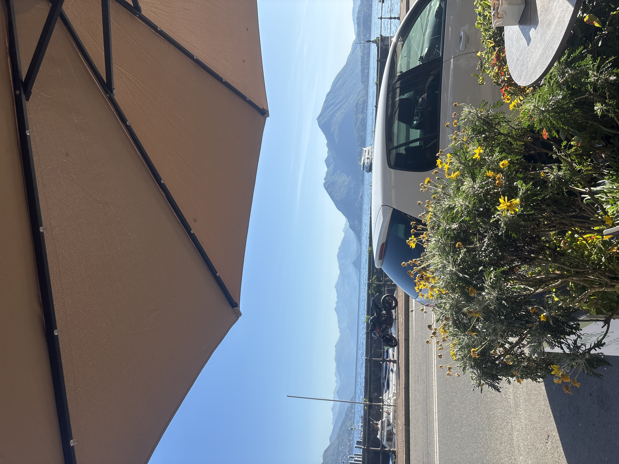 The scene depicts an outdoor setting in Binda, Italy, near a lake. A large tan umbrella partially occupies the left side of the frame, and a table with a small planter sits on the right. A white car is partially visible next to the table and planter. Across the road and beyond the railing, the lake stretches out with mountains in the distance under a clear blue sky. A boat is seen on the lake. Along the road, a motorcycle is parked.